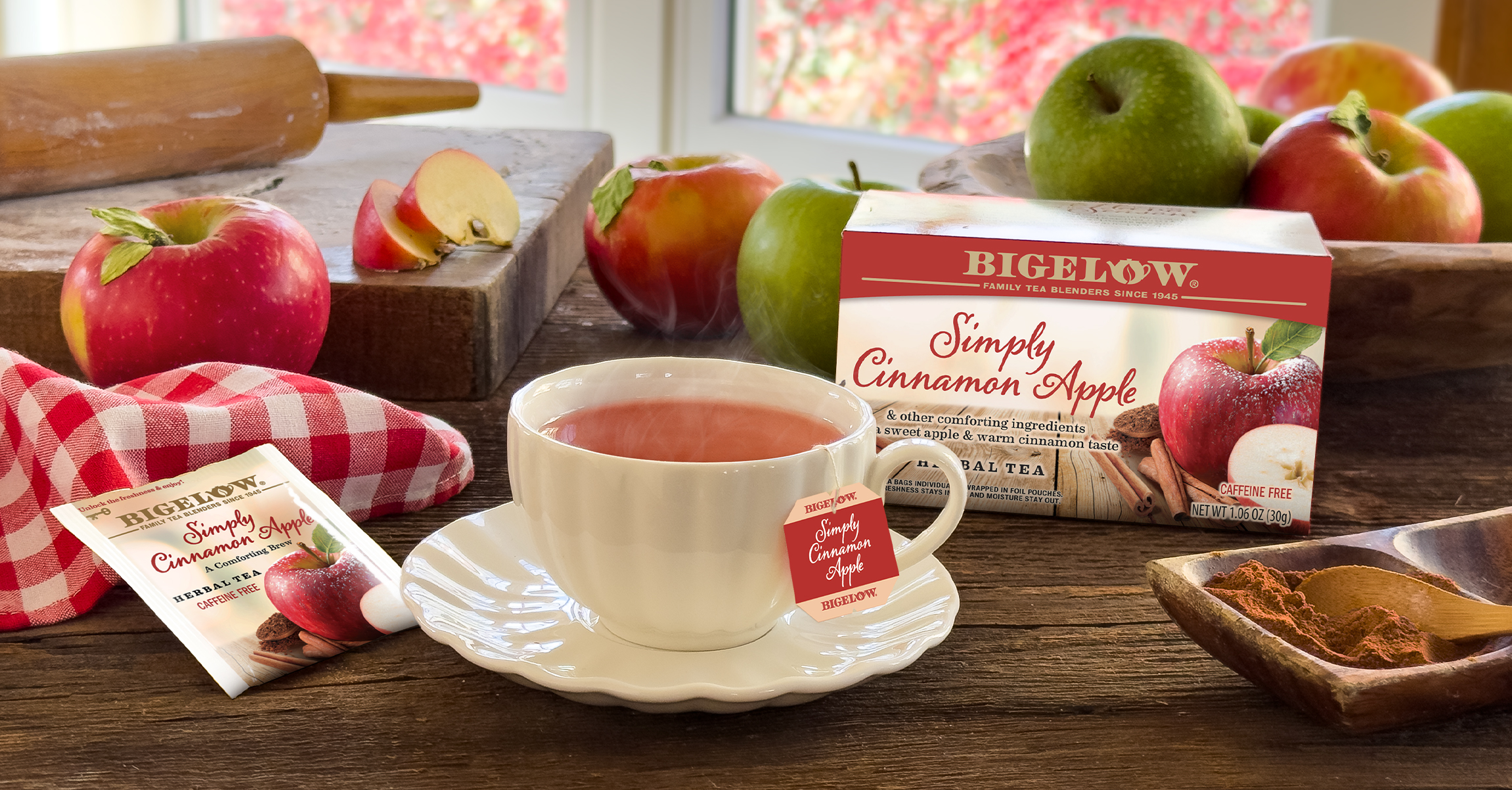 Bigelow Tea's Simply Cinnamon Apple captures the essence of irresistible warm baked apples without being overly sweet and features a caffeine-free blend of apple pieces, cinnamon, rose hips, hibiscus and more. This autumn tea flavor delivers buttery sweet apple and warm cinnamon flavors with fruity spice notes, making it ideal for fall entertaining, Thanksgiving gatherings, and cozy autumn evenings. It’s all of the indulgence of a baked treat but without the calories.